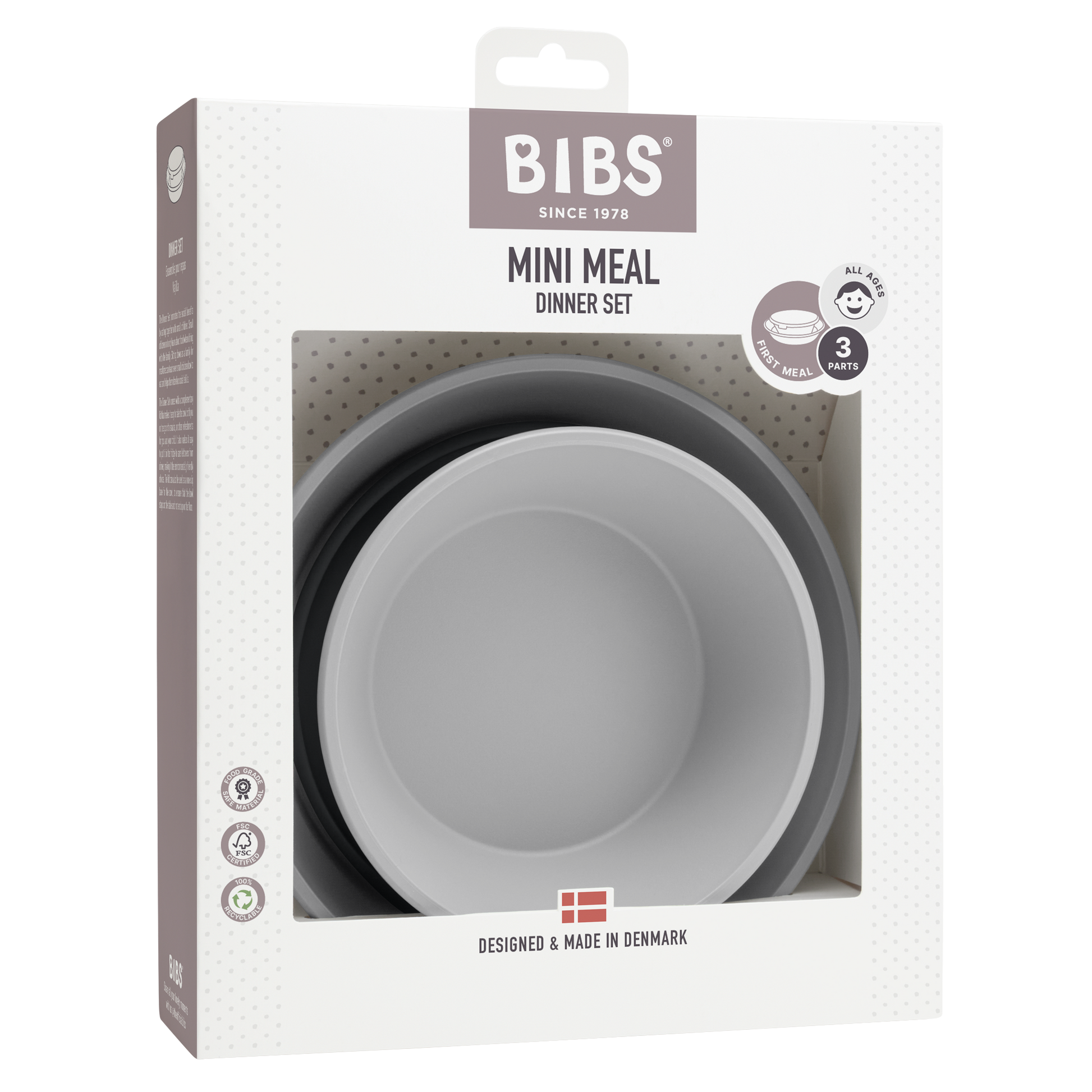 BIBS Dinner Plate Set consists of a plate and a bowl. The bowl comes with a lid. The Dinner Plate Set promotes the social benefits of eating together with small children.
