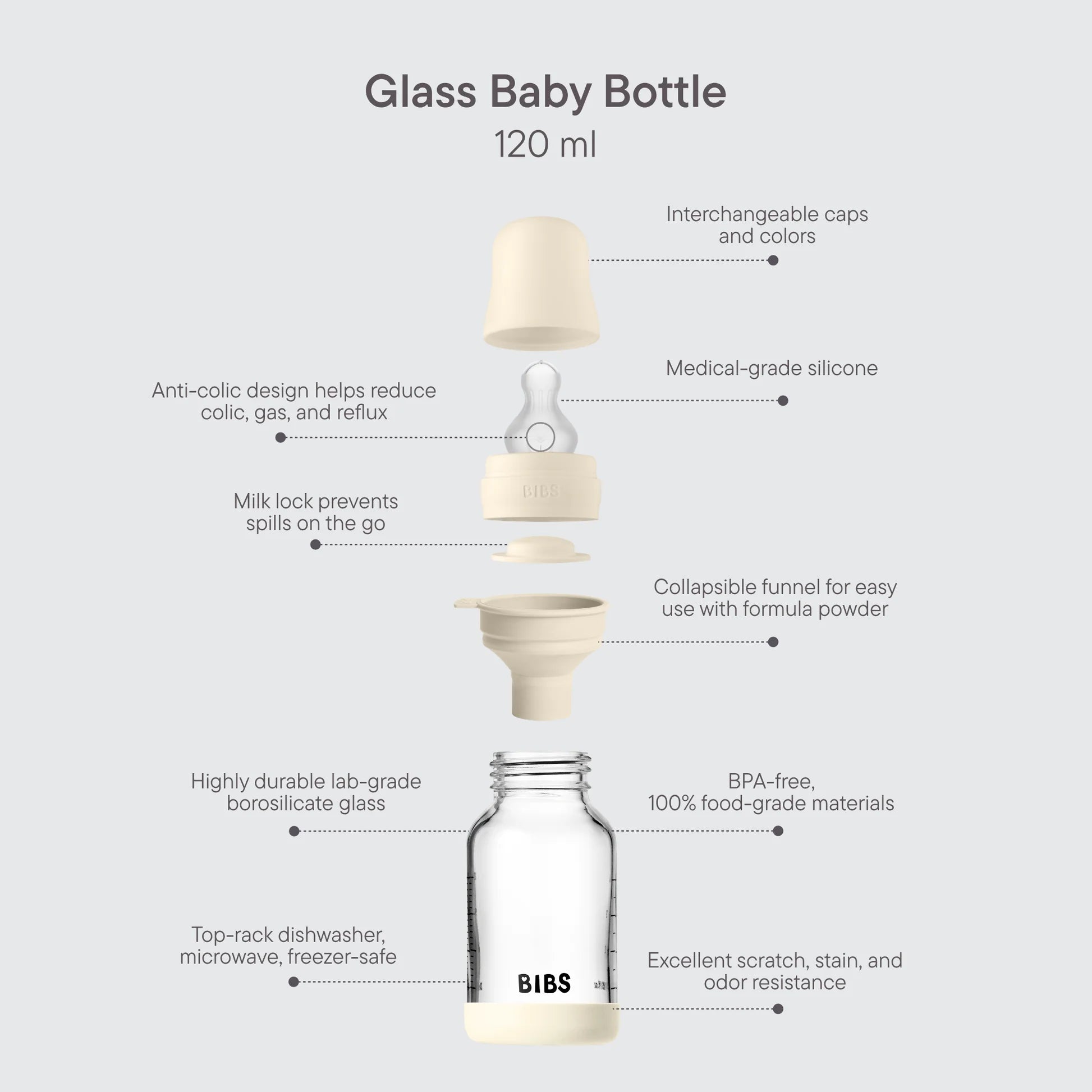 Includes a spill-preventing milk lock, collapsible funnel for formula powder, and measurements in standard feeding increments.