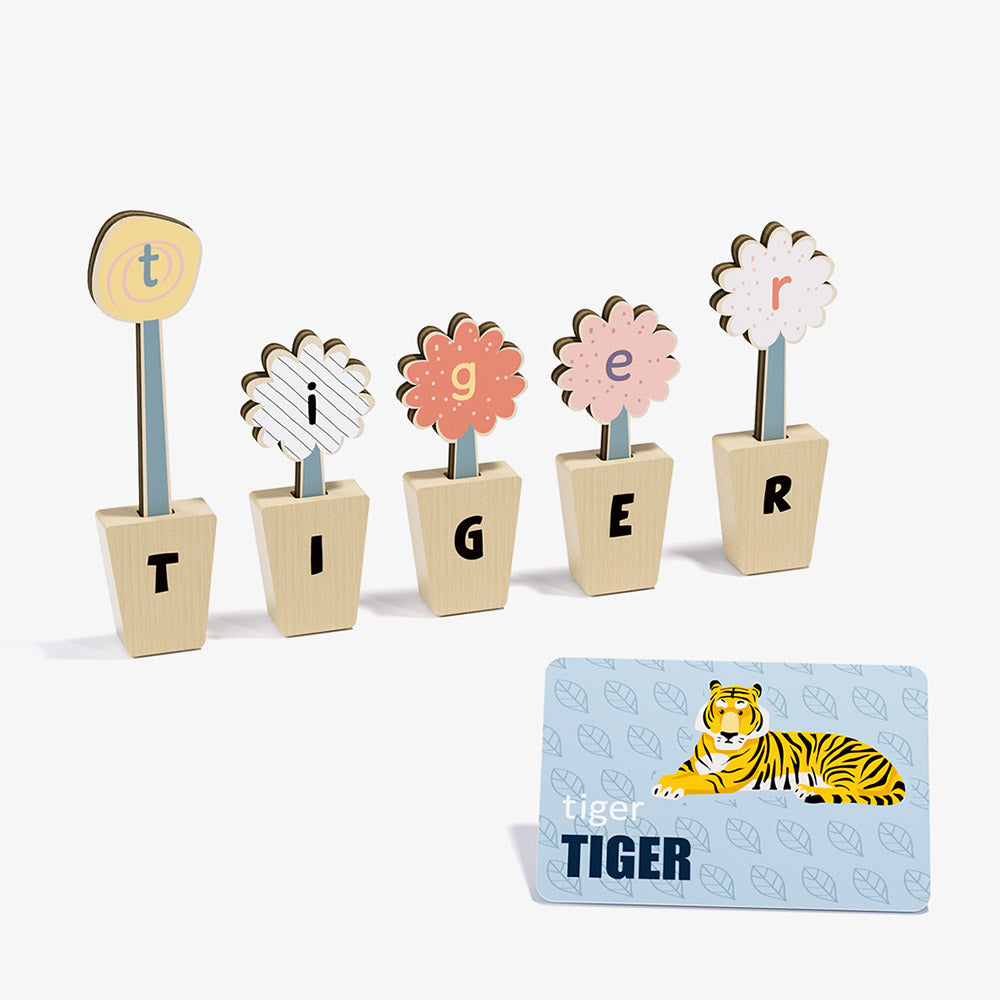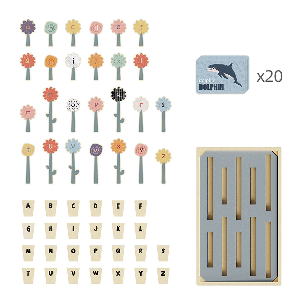 This Montessori-inspired wooden spelling game is designed to captivate the minds of young learners. With 26 wooden uppercase and 26 lowercase letters shaped like colourful garden flowers, plus 20 double-sided waterproof flashcards featuring delightful animal illustrations, ABC Flowers is more than just a toy. It's a comprehensive tool for literacy and word recognition, ideal for both homeschooling environments and classroom settings.